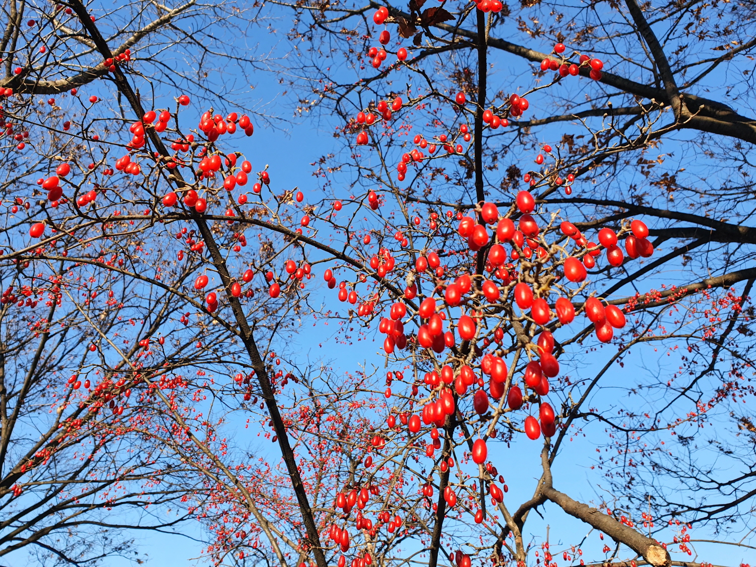 빨간색 산수유열매도 흰눈이 내리길 기다리는 듯합니다